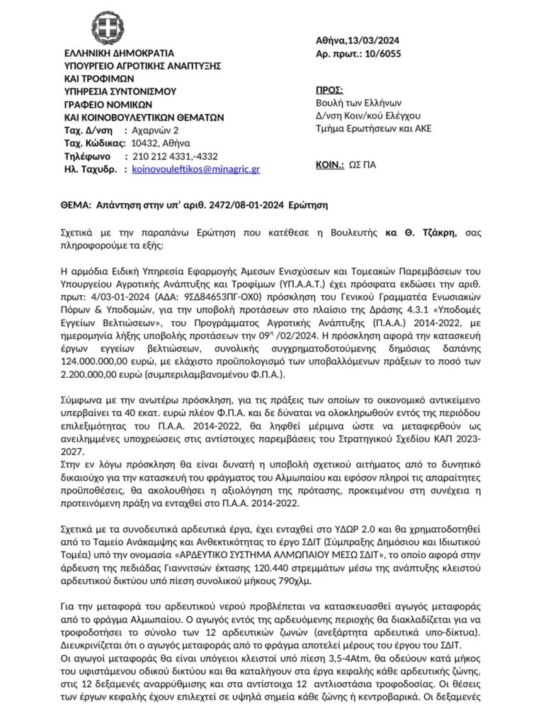 Η απάντηση του Υπουργείου Αγροτικής Ανάπτυξης και Τροφίμων σε Ερώτηση μου για το Φράγμα Αλμωπαίου, επιβεβαιώνει τις ανησυχίες για την εξέλιξη της κατασκευής του έργου.