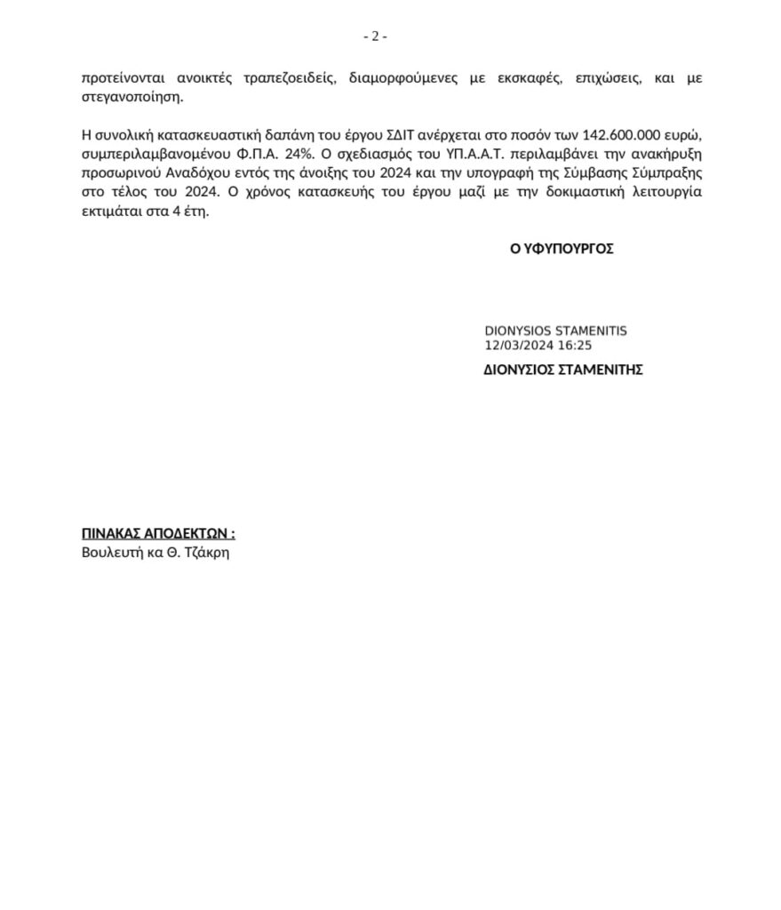 Δεύτερον: Αναφορικά με τα συνοδευτικά αρδευτικά του έργου, το αρμόδιο Υπουργείο Αγροτικής Ανάπτυξης και Τροφίμων ενημερώνει ότι έχουν ενταχθεί στο Πρόγραμμα ΥΔΩΡ 2.0 και θα χρηματοδοτηθούν από το Ταμείο Ανάκαμψης και Ανθεκτικότητας με τη μορφή ΣΔΙΤ, με το χρόνο κατασκευής του έργου να εκτιμάται στα 4 έτη και τη συνολική κατασκευαστική δαπάνη να ανέρχεται στα 142,6 εκ. €, συμπεριλαμβανομένου ΦΠΑ.