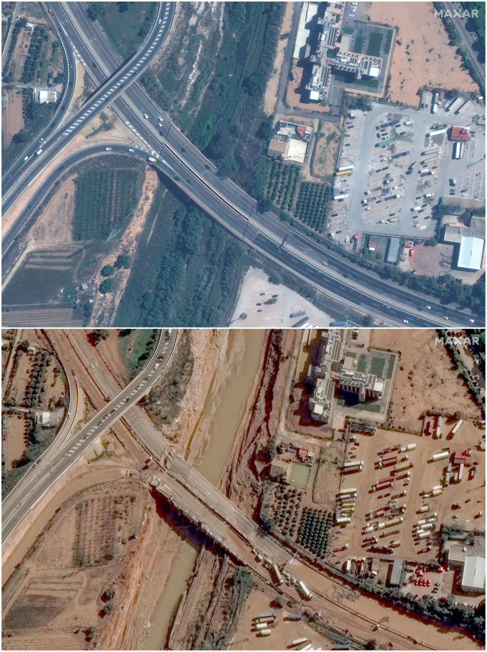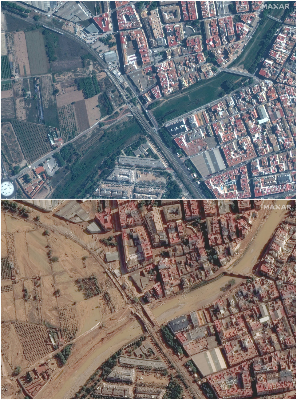 Δορυφορικές εικόνες από το πριν και το μετά τις φονικές πλημμύρες στην Βαλένθια, αποτυπώνουν το μέγεθος της καταστροφής που άφησε το πέρασμα της κακοκαιρίες Dana.