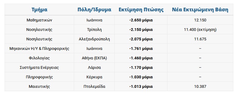 Αξιοσημείωτο είναι το γεγονός ότι παρά την υψηλή ζήτηση για επαγγέλματα Υγείας, τμήματα όπως η Νοσηλευτική και η Μαιευτική καταγράφουν μεγάλες πτώσεις. Ειδικά στη Νοσηλευτική Τρίπολης, η πτώση αγγίζει τα 2.150 μόρια, ενώ στην Αλεξανδρούπολη φτάνει τα 2.075 μόρια.
