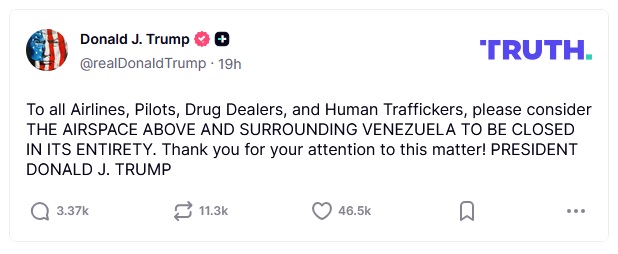 Ο Τραμπ, σε μια ανάρτηση στο Truth Social, δήλωσε: «Προς όλες τις αεροπορικές εταιρείες, τους πιλότους, τους εμπόρους ναρκωτικών και τους εμπλεκόμενους με εμπορία ανθρώπων, παρακαλώ θεωρήστε ότι Ο ΕΝΑΕΡΙΟΣ ΧΩΡΟΣ ΠΑΝΩ ΚΑΙ ΓΥΡΩ ΑΠΟ ΤΗ ΒΕΝΕΖΟΥΕΛΑ ΕΙΝΑΙ ΚΛΕΙΣΤΟΣ ΕΞ ΟΛΟΚΛΗΡΟΥ».