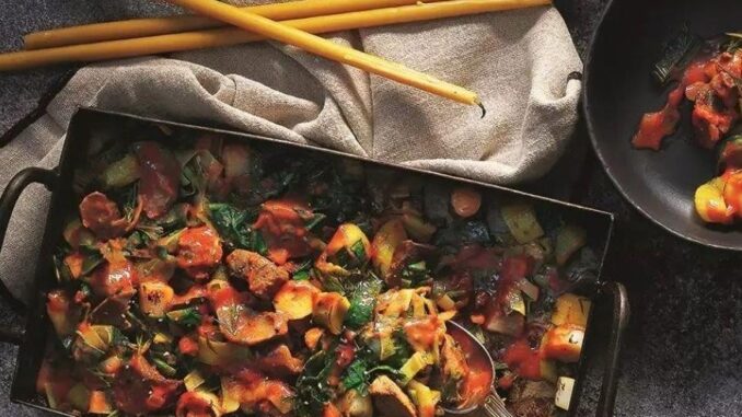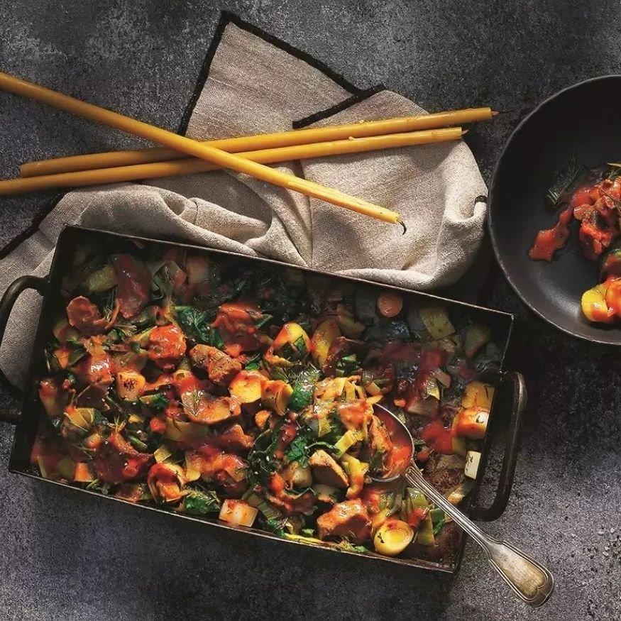 Ένα τέταρτο πριν από το τέλος, αφαιρούμε τη λαδόκολλα και το αλουμινόχαρτο και αφήνουμε τη μαγειρίτσα να πάρει χρώμα. Το φαγητό μας έχει απορροφήσει τα υγρά του, η σάλτσα του έχει πήξει και έχει μείνει με το λάδι του. Σερβίρεται σε θερμοκρασία δωματίου.